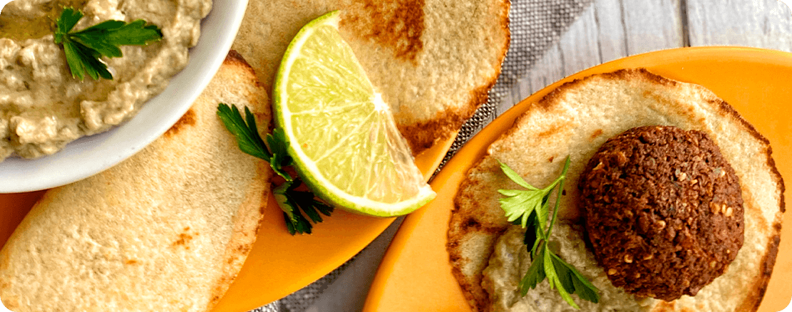 5. Sirva acompanhado do baba ghanoush, o falafel, limão e azeite.