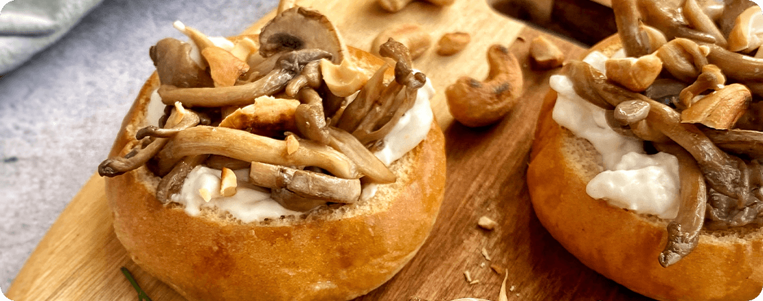 2. Recheie com uma colherada de creme de queijo, e sobre ele os cogumelos salteados;